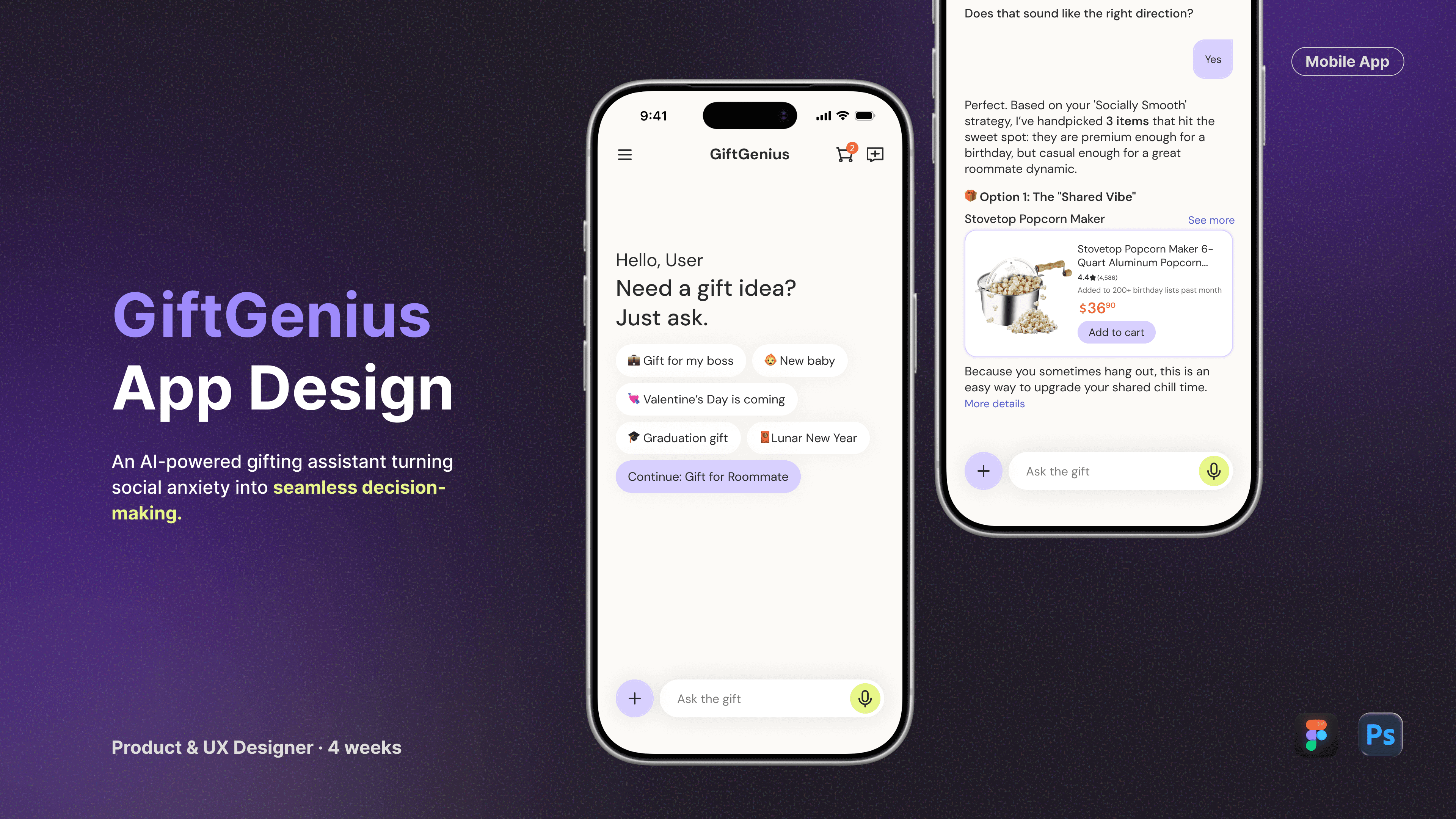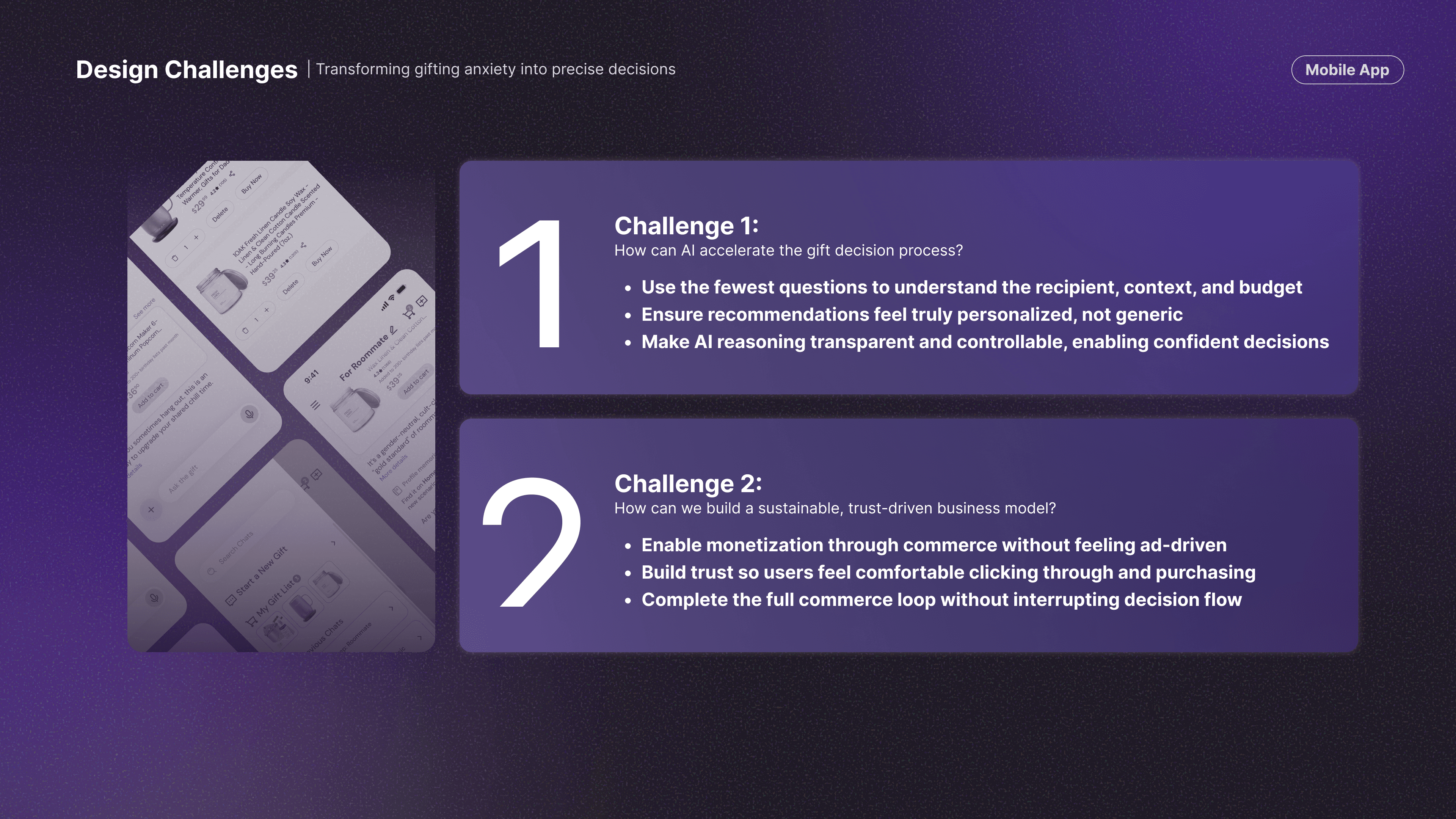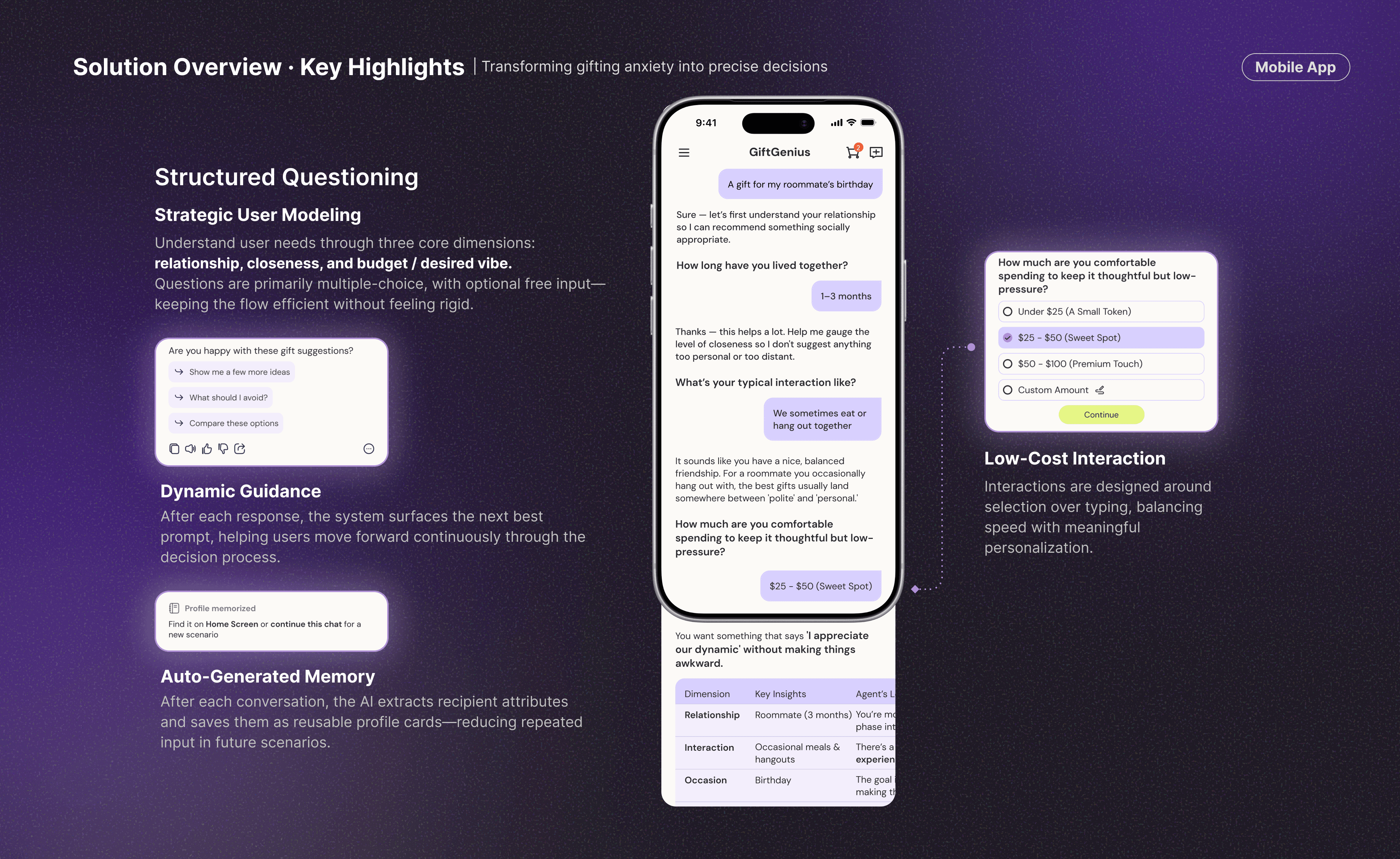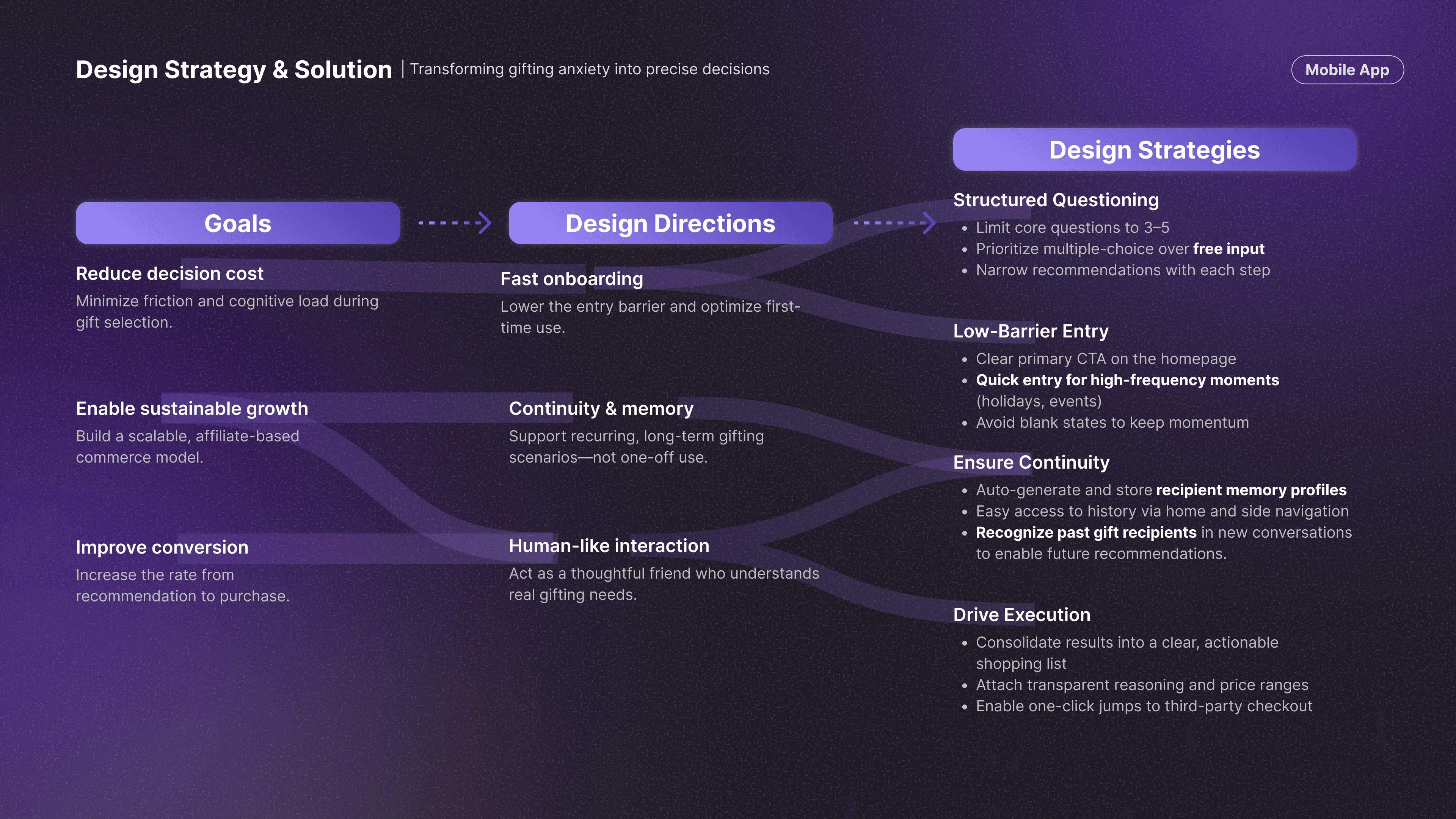 GiftGenius is an all-in-one AI-powered platform that delivers personalized gift recommendations based on relationship, context, and user intent. I led the UX strategy and end-to-end product design, from user research and prompt framework development to interaction design and system structuring.
