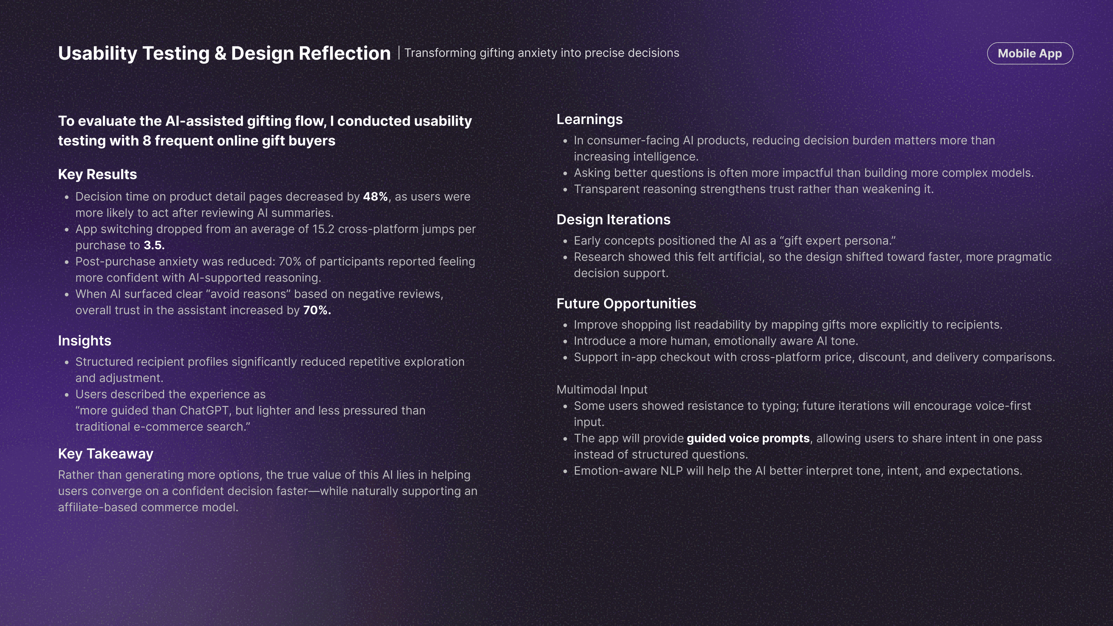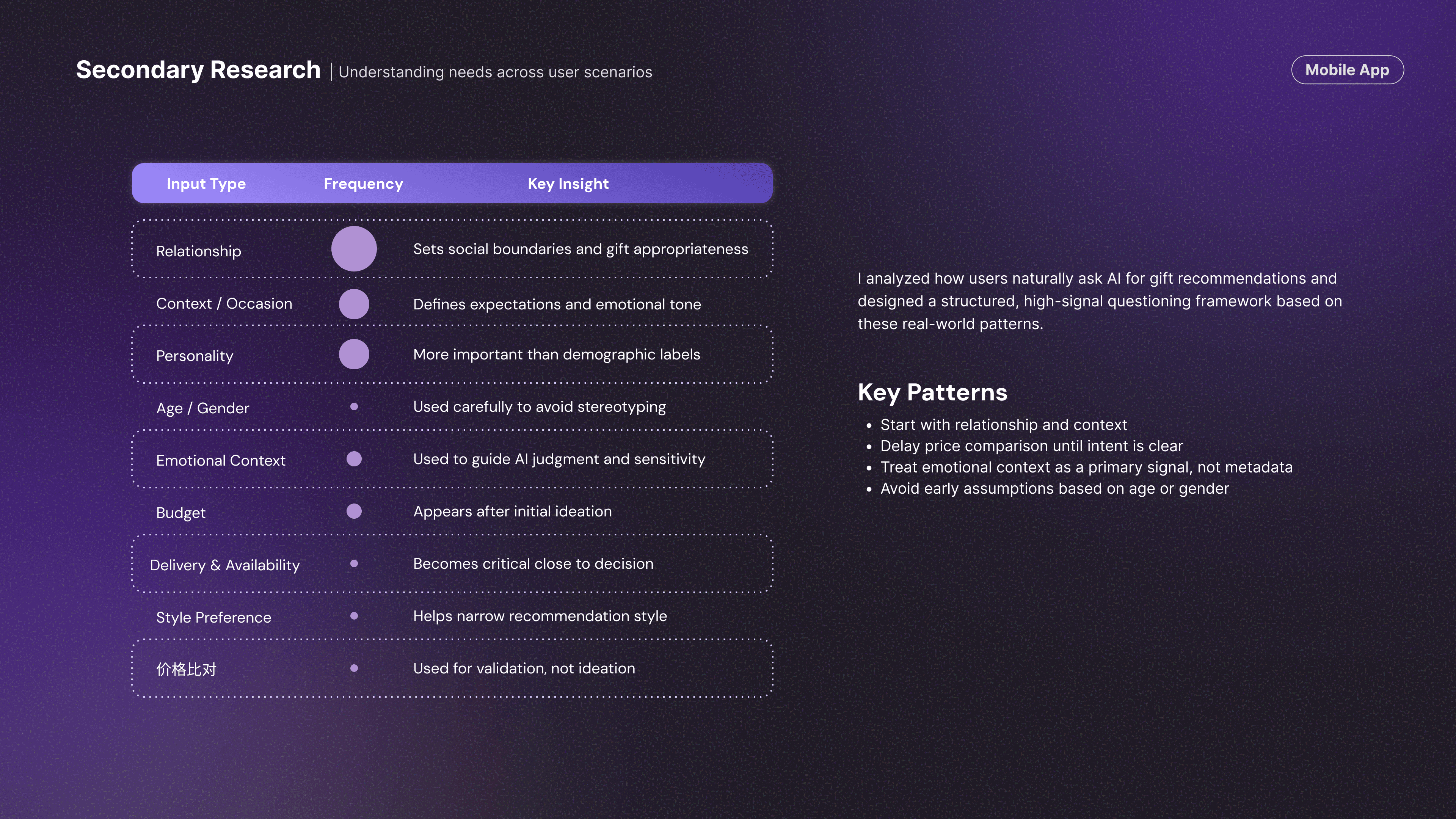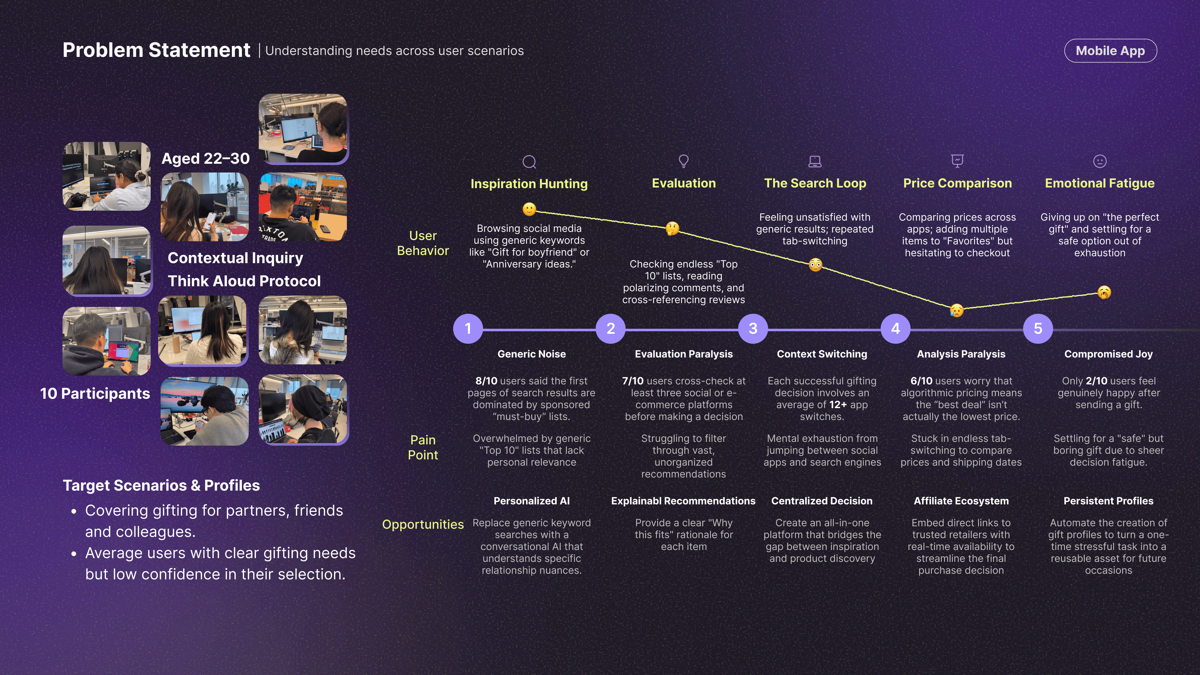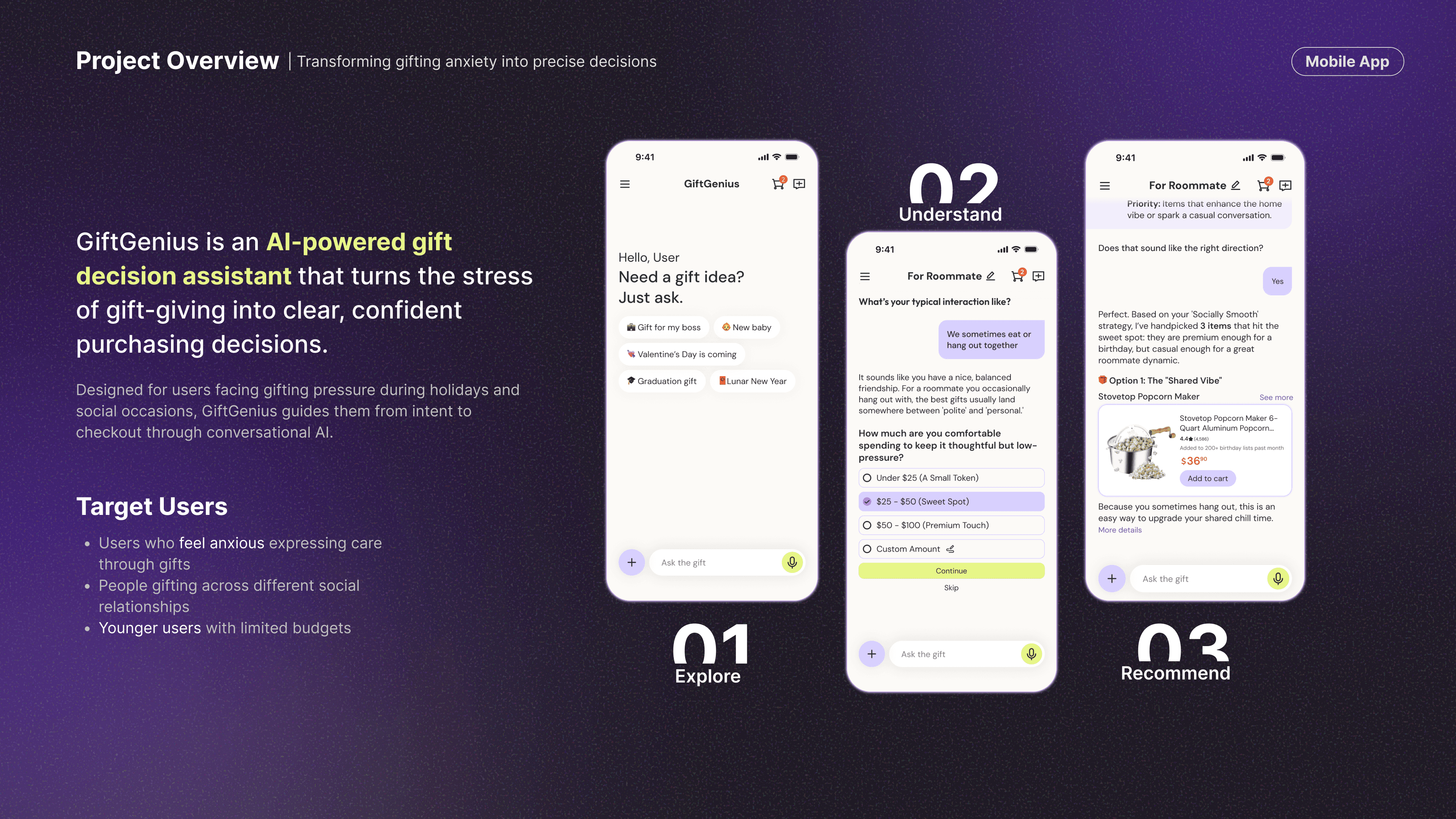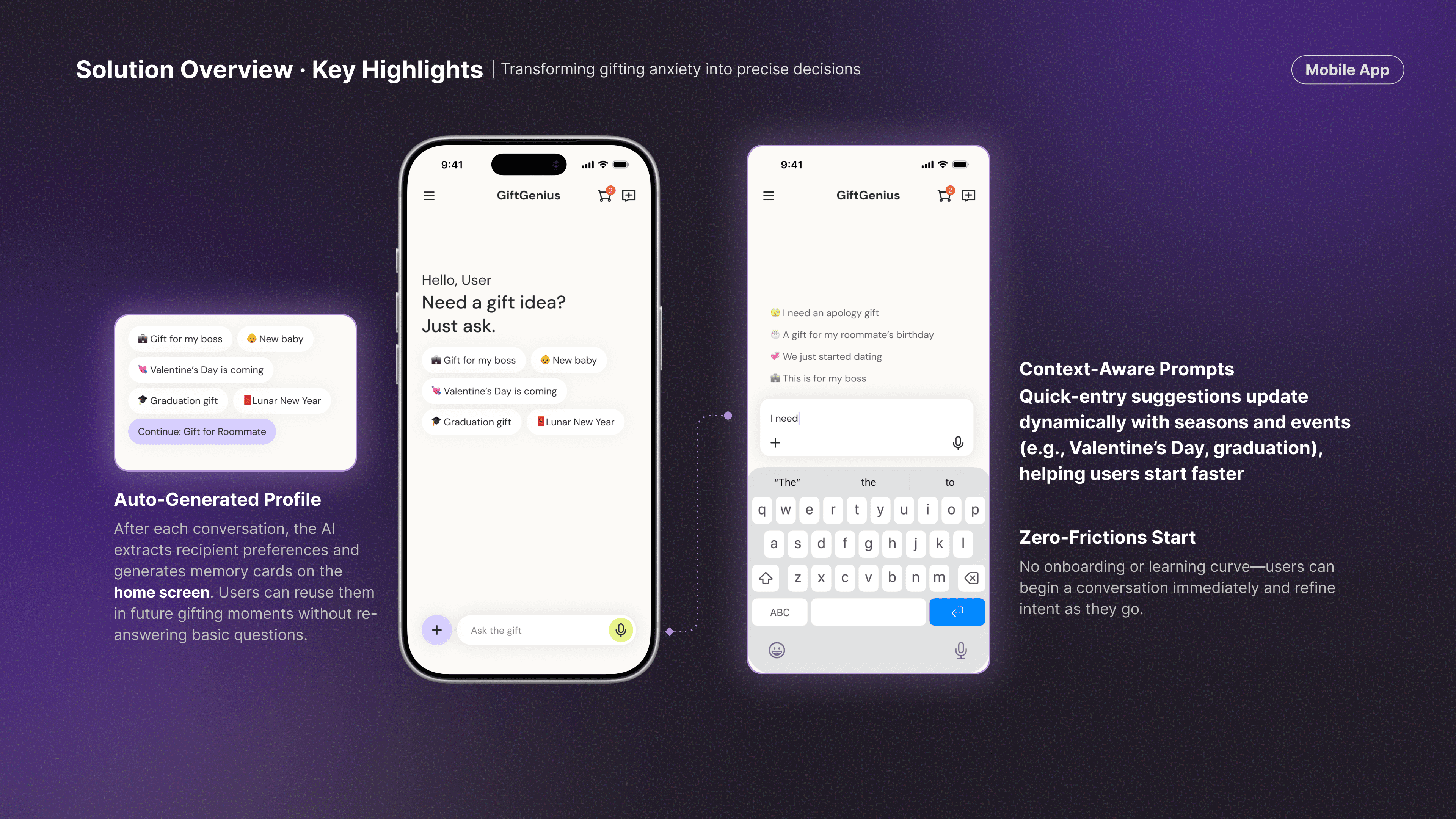 GiftGenius is an all-in-one AI-powered platform that delivers personalized gift recommendations based on relationship, context, and user intent. I led the UX strategy and end-to-end product design, from user research and prompt framework development to interaction design and system structuring.
