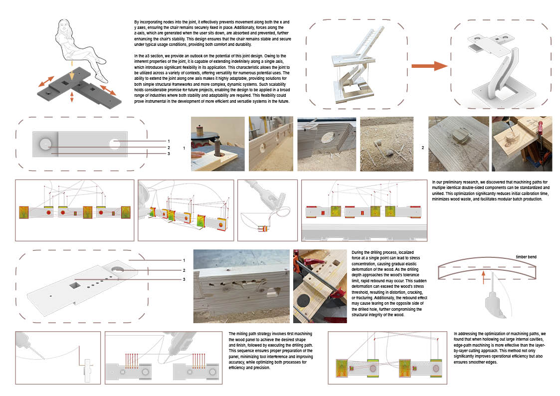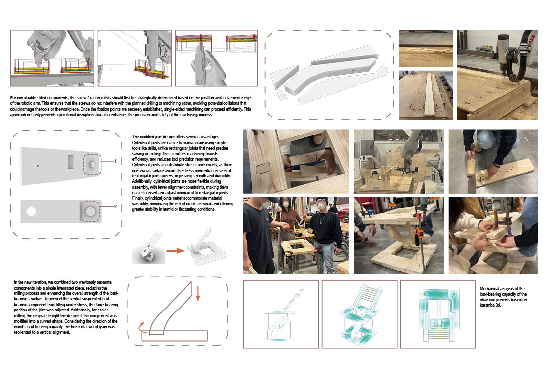 TimberLift is a research-based fabrication project that investigates robotic machining strategies for optimizing timber joints in cantilevered furniture. Using an ABB robotic arm and stress-informed cylindrical joints, the project enhances structural performance while reducing material waste through standardized double-sided machining and adaptive grain alignment.