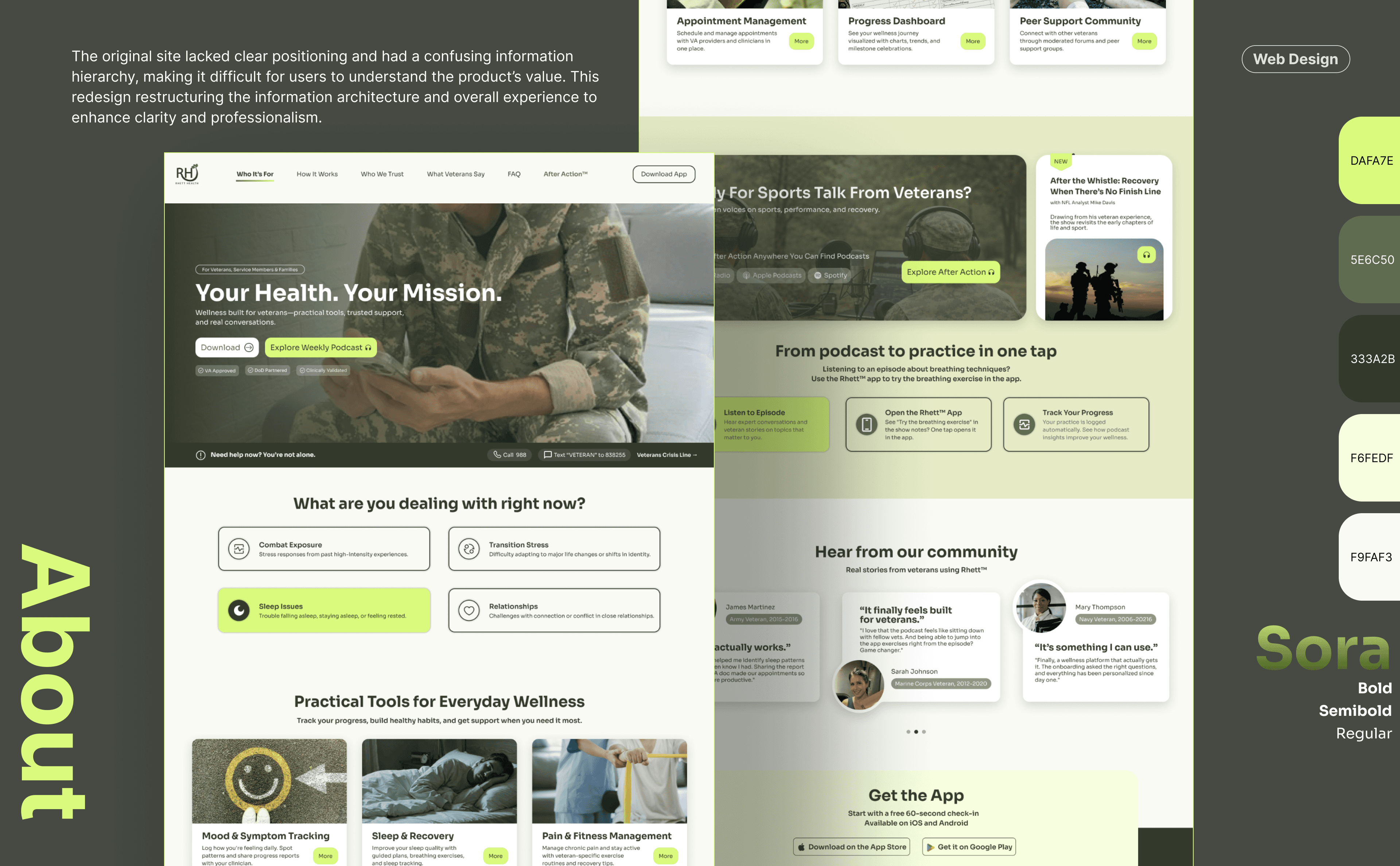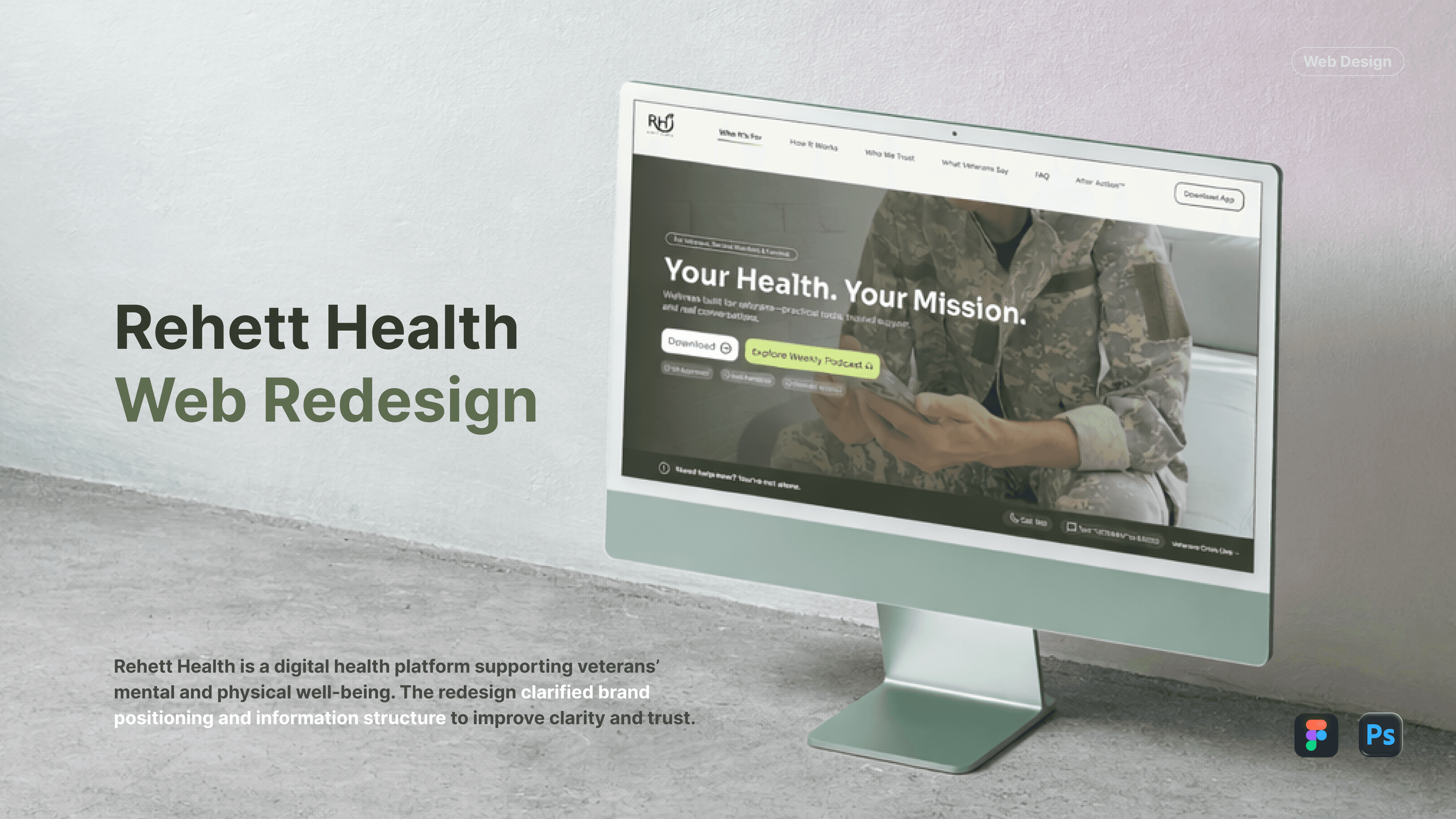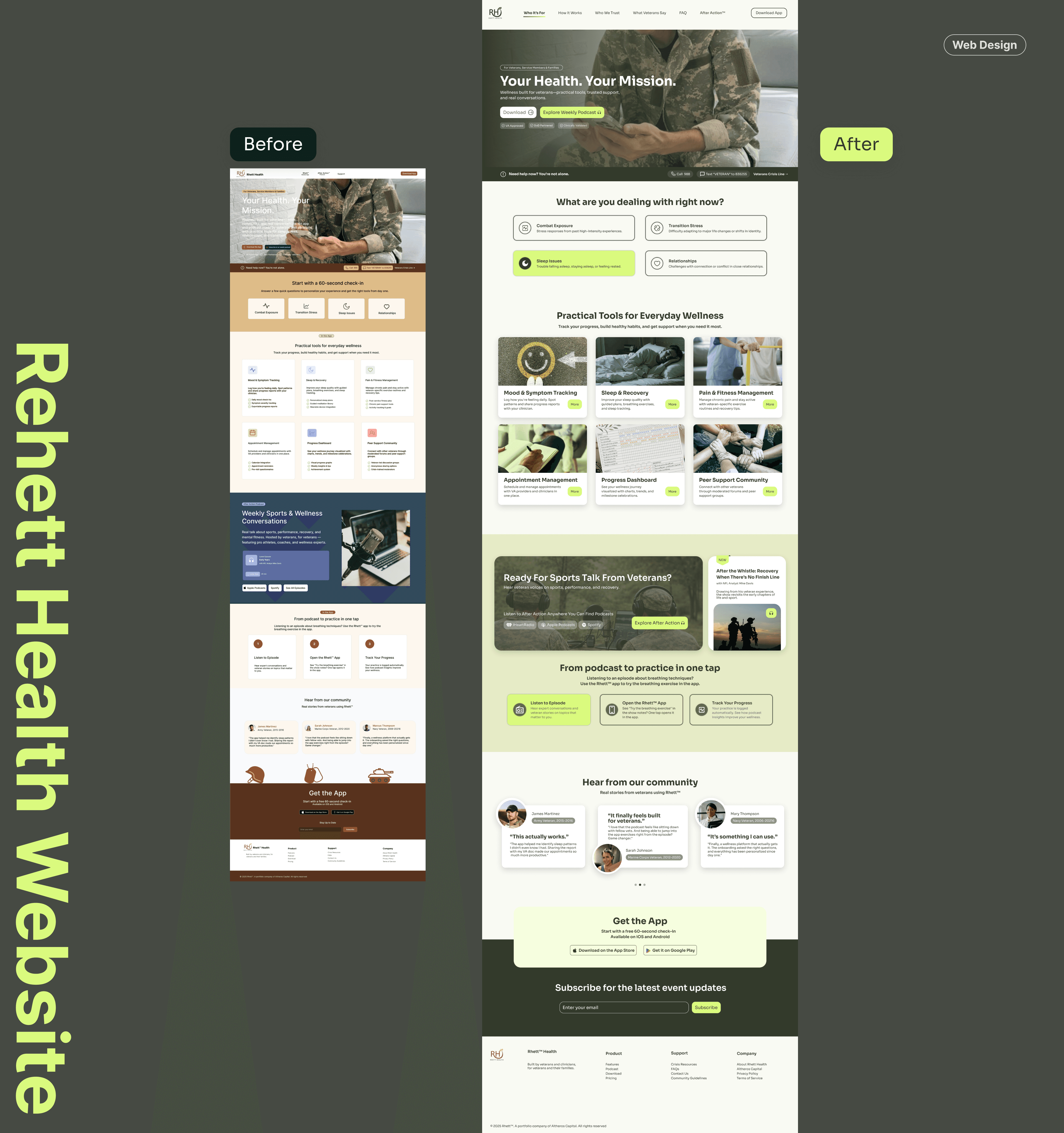 Rehett Health is a digital health platform focused on veterans’ mental and physical well-being. The original website had unclear brand positioning, a confusing information hierarchy, and content overload, making it difficult for users to quickly understand the product. This redesign clarified the structure and visual language to improve clarity and trust.