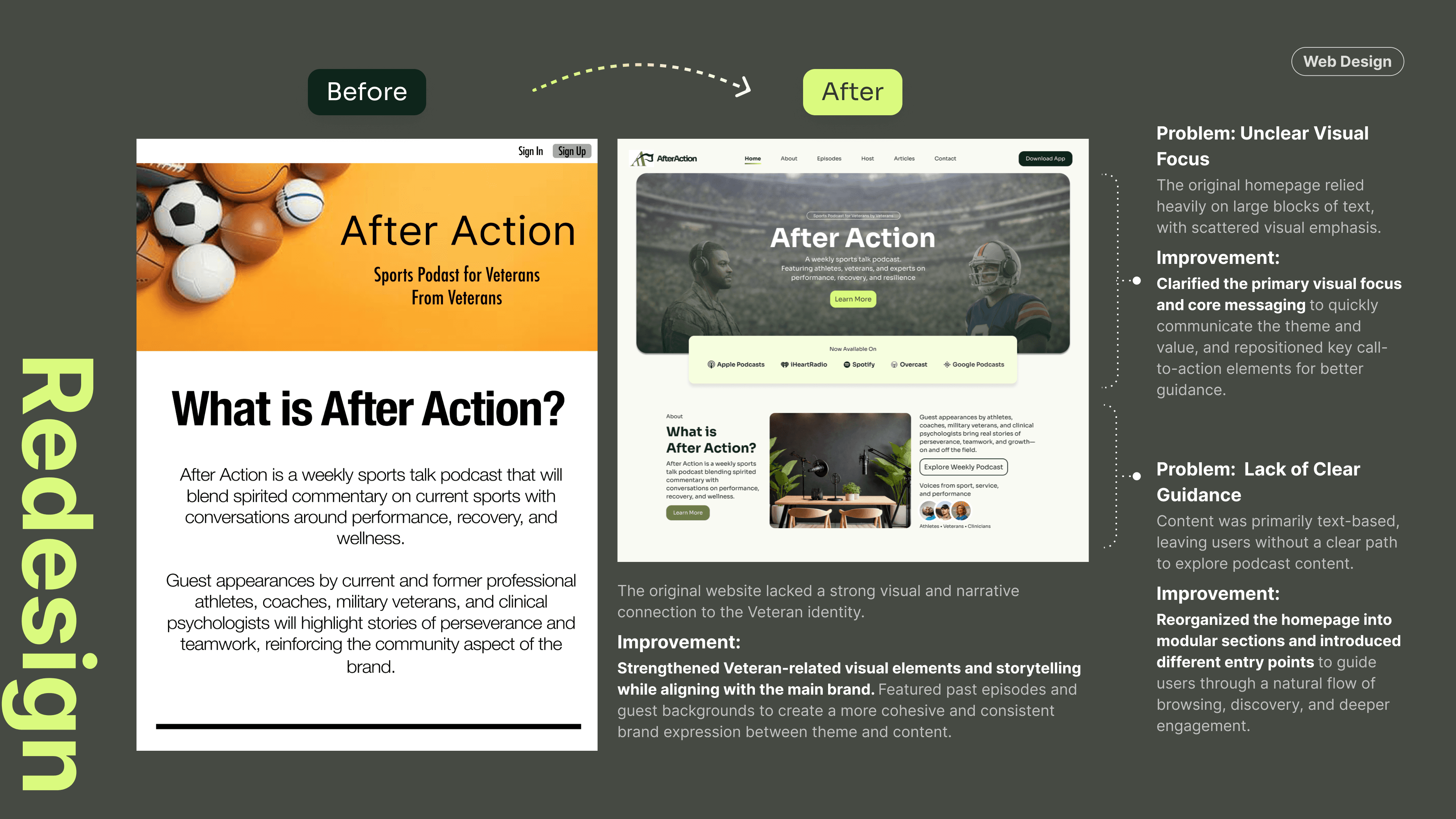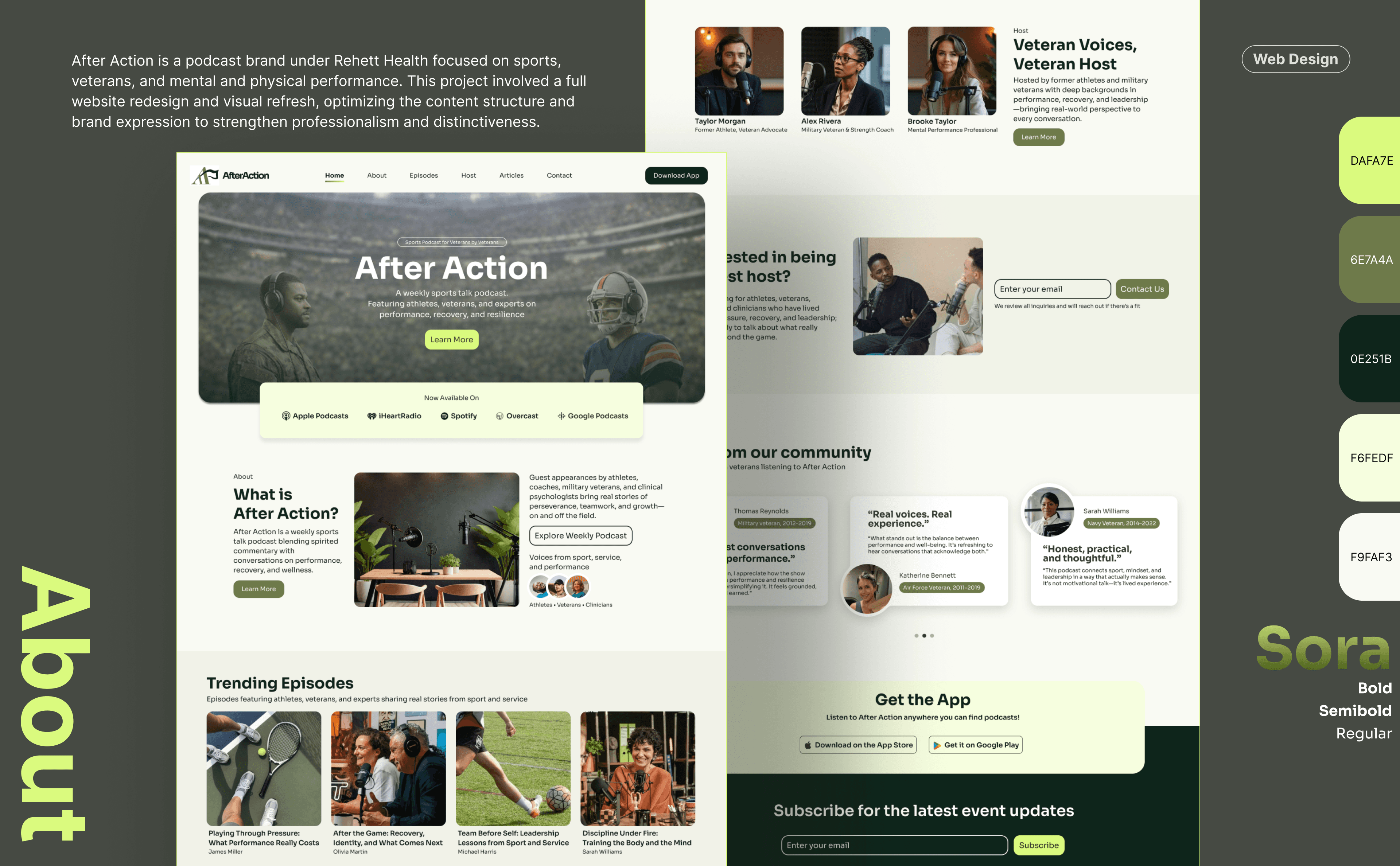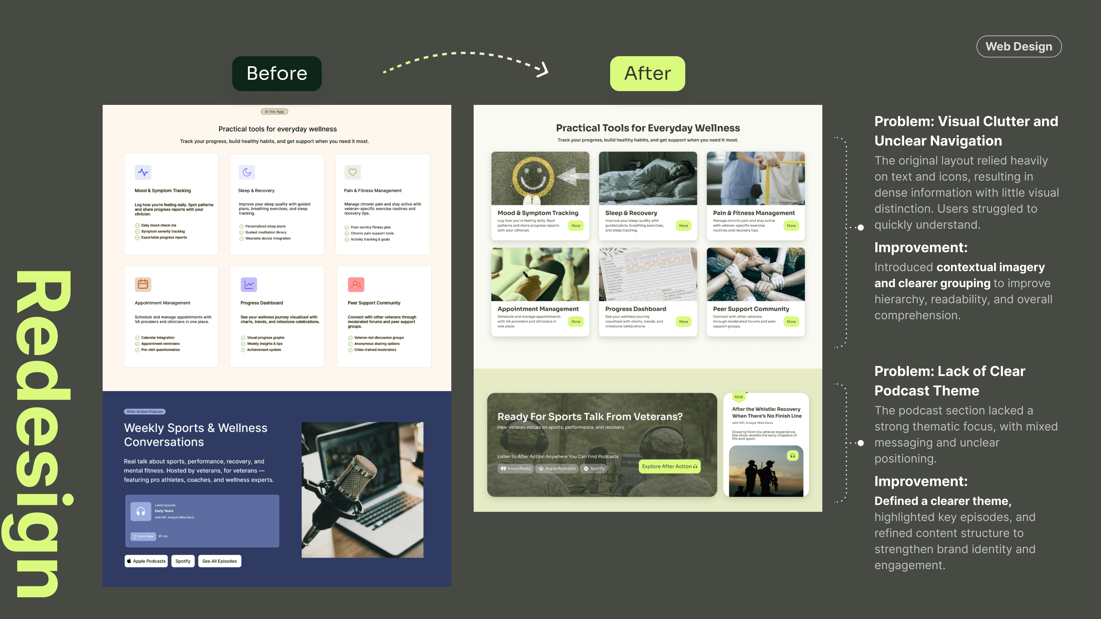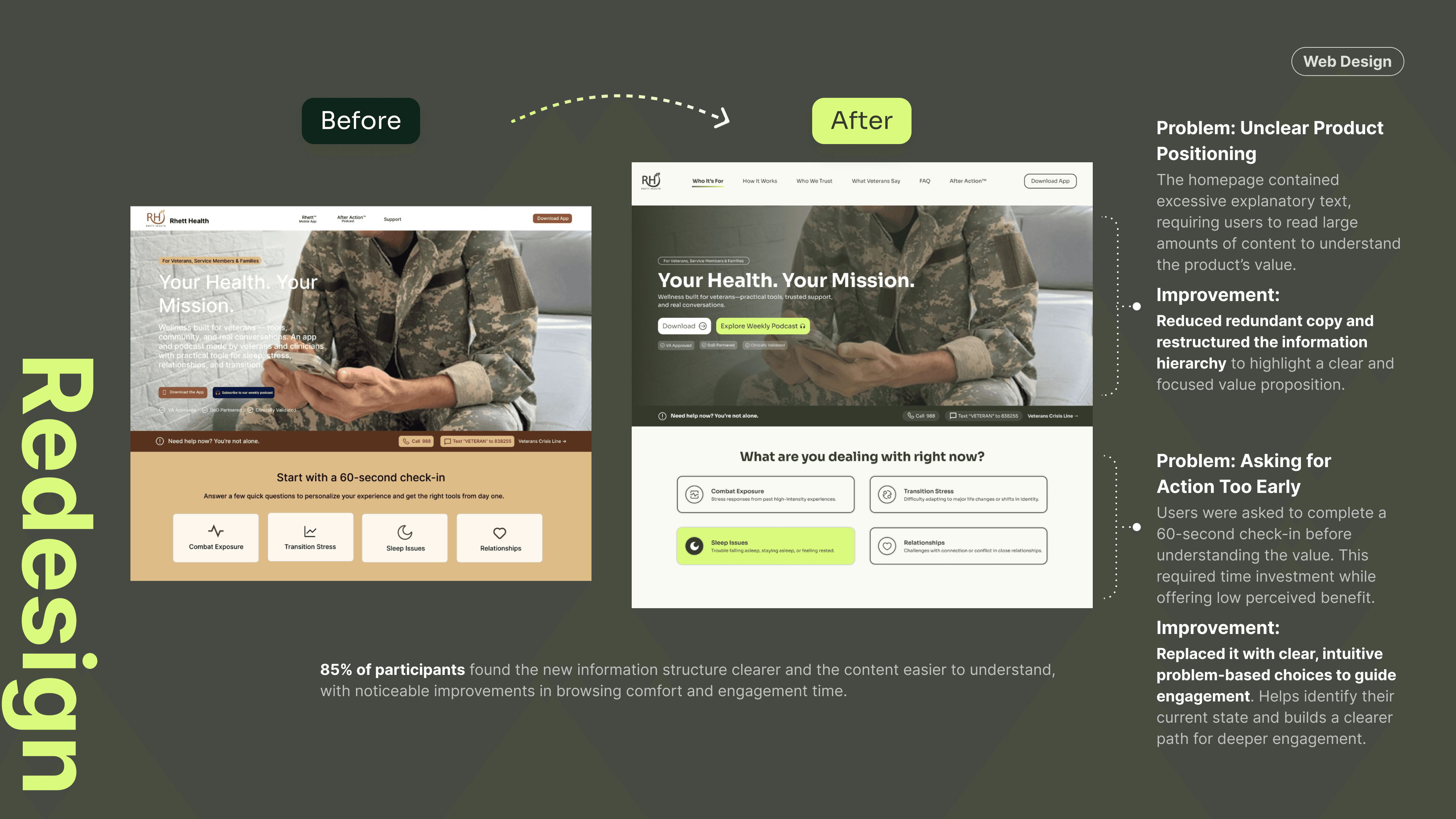 Rehett Health is a digital health platform focused on veterans’ mental and physical well-being. The original website had unclear brand positioning, a confusing information hierarchy, and content overload, making it difficult for users to quickly understand the product. This redesign clarified the structure and visual language to improve clarity and trust.